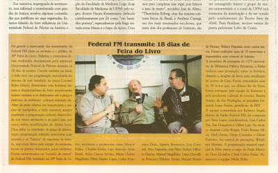 Em novembro de 2002, durante a 30ª Feira do Livro de Pelotas, tive a oportunidade de entrevistar Moacyr Scliar. Conversamos longamente no estúdio da Rádio da Universidade Federal de Pelotas que sempre se instala na praça durante o período da feira. Tudo o que eu disser de bom do Moacyr aqui no blog, será enfadonho e repetitivo. Prefiro narrar nossa conversa acerca de “A vida de Pi”. Naquele já distante 2002, Moacyr estava às voltas com o repentino sucesso do livro do escritor canadense, Yann Martel, que ganhara o prêmio literário mais importante da língua inglesa. Um escritor desconhecido estava nas manchetes das principais folhas literárias do mundo depois de ter sido consagrado com um livro que era – para Scliar, uma cópia escandalosa de Max e os felinos. Claro, naquele momento, sua editora já estava cuidando do caso, já reconhecido publicamente como um plágio, embora negado por Martel. Scliar, num misto de descontentamento e incredulidade, assistia de Porto Alegre o seu livro – com outro título e "autor", ganhar elogios e mais elogios da crítica internacional... Esse foi o mote para conversarmos sobre criação literária, editoras, prêmios, novos – e velhos – escritores. Sua alegria por se encontrar em meio a uma praça repleta de livros era evidente. A hora dos autógrafos já havia chegado e Scliar não saía de nosso estúdio de tão animada que estava nossa conversa. Isso se pode ver na fotografia que ilustra a matéria d'O Jornal da UFPel, de novembro de 2002.